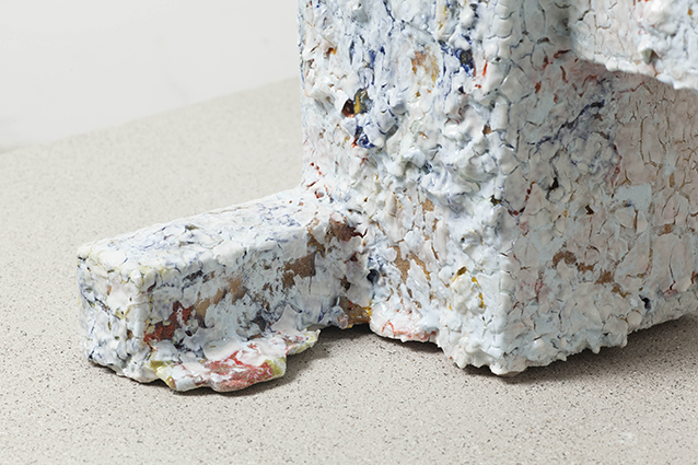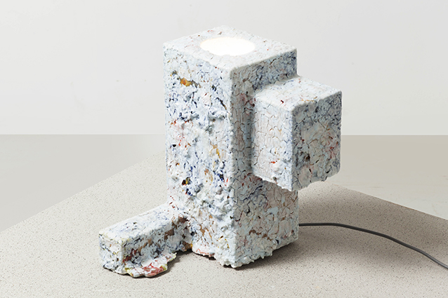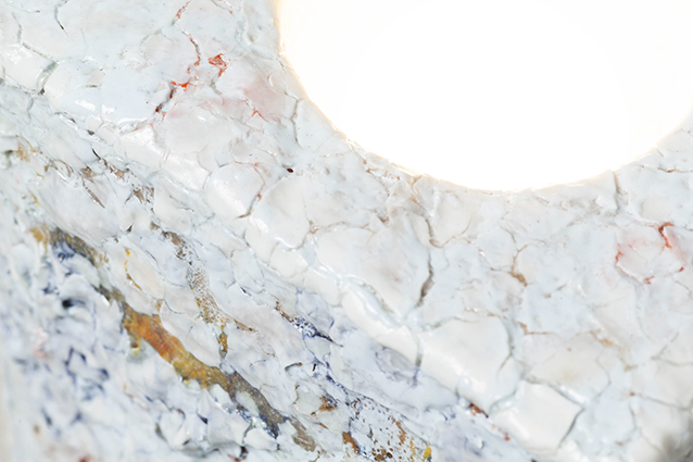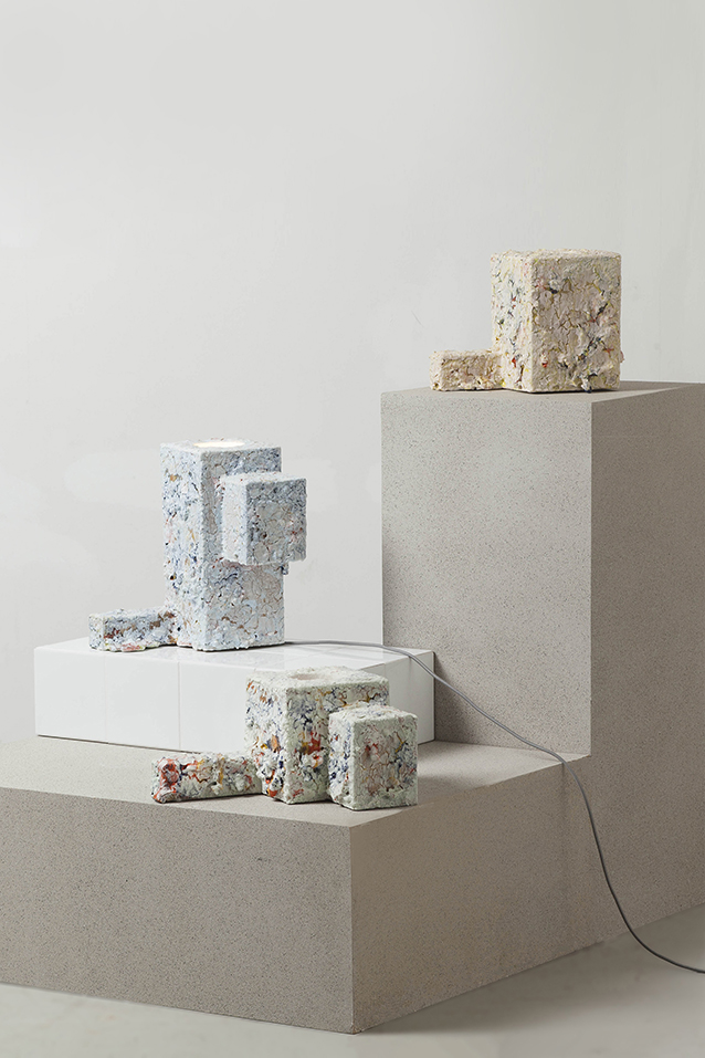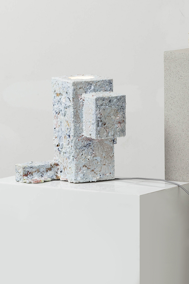 For this Lighting pieces, Irina combines sandblasted ceramic shapes with layers of glaze and rough concrete surfaces to evoke the decay of architectural structures, with dusty and monochrome colours, layers of peeling paint and crumbling stone.