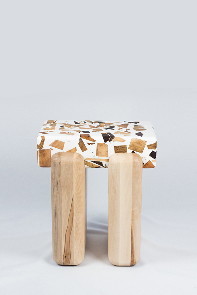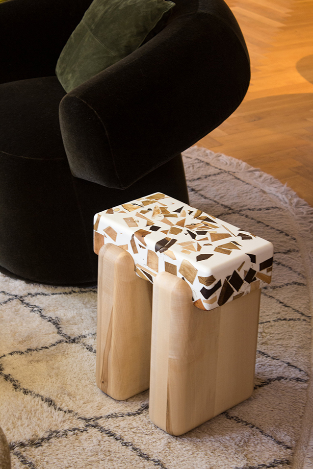 Through the careful combination of different wood types and resin, the final result is never fully controlled: as the resin cures, each piece develops a unique surface and character, making every stool truly one-of-a-kind.This process requires trust in the material, embracing the dialogue between intention and chance. The result balances delicacy and strength: the tactile, almost sweet appearance contrasts with its solid weight and presence.