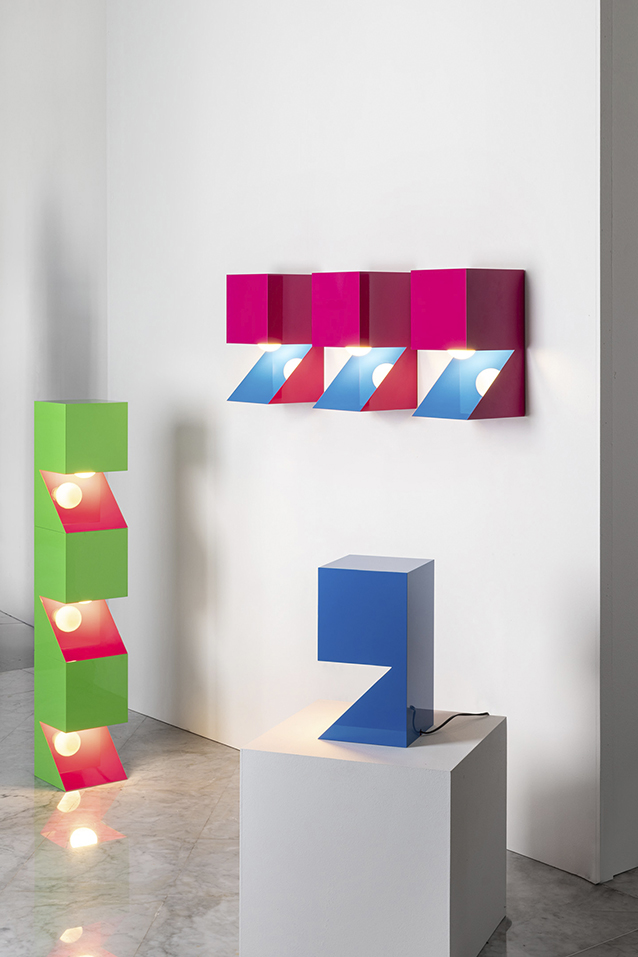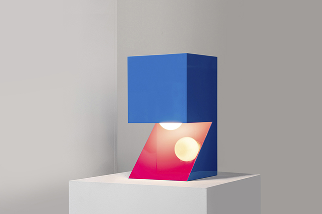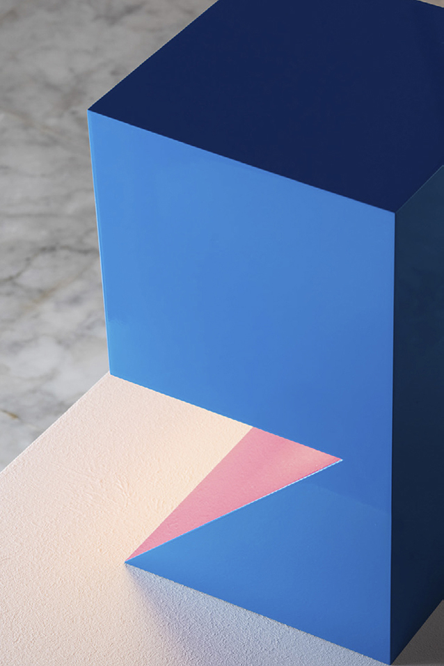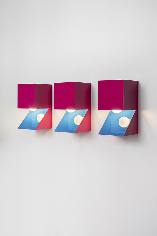 NEFERTITI challenges the basic truth of perception. It seeks to suspend certainty, to evoke a realm that feels simultaneously metaphysical and ironic. The lamp consciously deceives the eye: the light source is hidden, the colour shifts suggest a subtraction from a solid form, and what appears as a volume reveals itself, perhaps, to be a thin metal sheet. Even its material nature is ambiguous—the V-cut technique enables edges impossible with standard bending, while glossy car paint conceals the true identity of the metal beneath. The interplay between rigorous geometry and playful colour, between sculpture and function, defines NEFERTITI as a mysterious object open to multiple interpretations. It is finite yet open-ended, self-referential yet full of reminiscence.