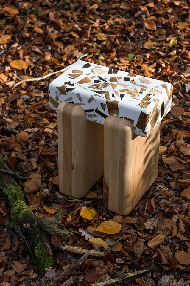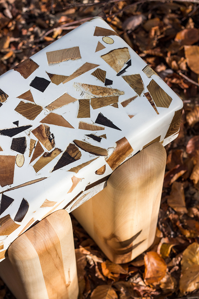 Through the careful combination of different wood types and resin, the final result is never fully controlled: as the resin cures, each piece develops a unique surface and character, making every stool truly one-of-a-kind.This process requires trust in the material, embracing the dialogue between intention and chance. The result balances delicacy and strength: the tactile, almost sweet appearance contrasts with its solid weight and presence.