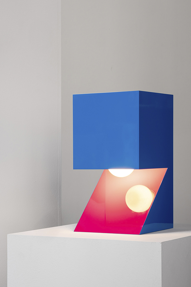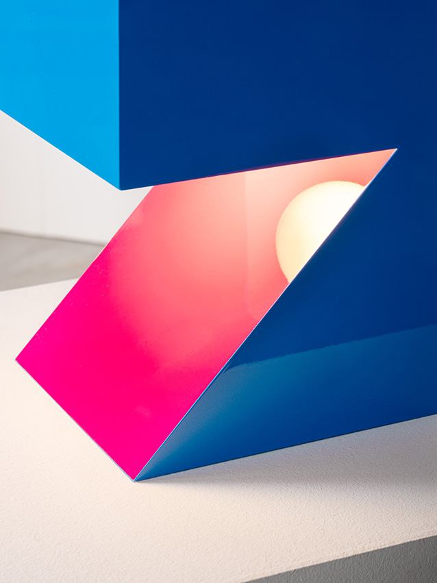 NEFERTITI challenges the basic truth of perception. It seeks to suspend certainty, to evoke a realm that feels simultaneously metaphysical and ironic. The lamp consciously deceives the eye: the light source is hidden, the colour shifts suggest a subtraction from a solid form, and what appears as a volume reveals itself, perhaps, to be a thin metal sheet. Even its material nature is ambiguous—the V-cut technique enables edges impossible with standard bending, while glossy car paint conceals the true identity of the metal beneath. The interplay between rigorous geometry and playful colour, between sculpture and function, defines NEFERTITI as a mysterious object open to multiple interpretations. It is finite yet open-ended, self-referential yet full of reminiscence.