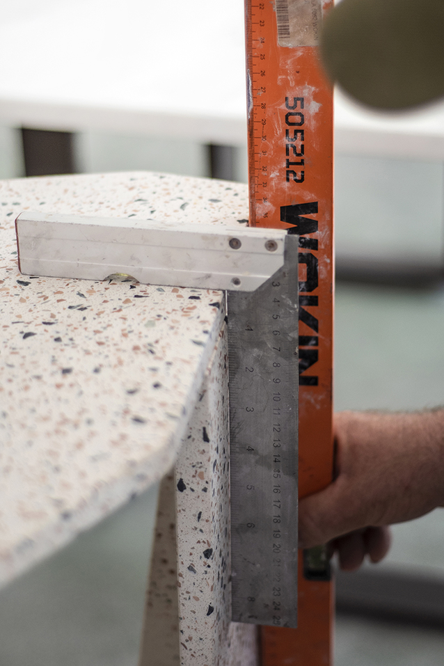 The components of the objects are arranged within the slab using a nesting technique, allowing for optimal use of resources while significantly reducing off-cuts.